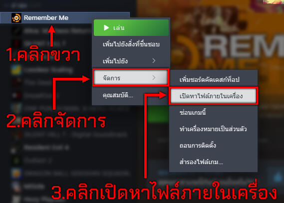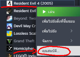 8. เข้าไปที่ Steam คลิปขวาที่เกม Resident Evil 4 (2005) แล้วกด คุณสมบัติ.. ตามภาพ